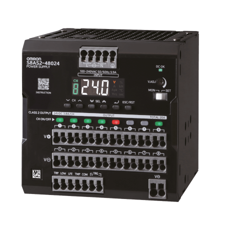De S8AS-serie bestaat uit intelligente voedingen met digitale circuitbeveiligingen in één pakket. De uitgang is opgedeeld in 6 of 8 kanalen en voorziet in een instelbaar schakelstroombereik voor elk kanaal in stappen van 0,1 A. Het kan ruimte in de installatie besparen in panelen met minder bedrading door de integratie van circuitbeveiligingsfuncties.